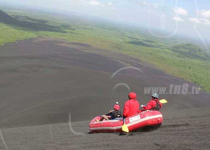 En busca de adrenalina extrema, un grupo de 18 turistas y empresarios extranjeros procedentes de Costa Rica, Canadá, India y Estados Unidos, realizaron un deslizamiento sobre una balsa inflable desde la cima del volcán Cerro Negro, en León, Nicaragua.