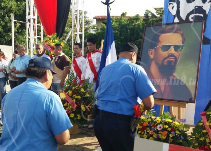 Miembros de la Policía Nacional del departamento de León colocaron flores en el mausoleo de los héroes y mártires recordando al fundador del Frente Sandinista.