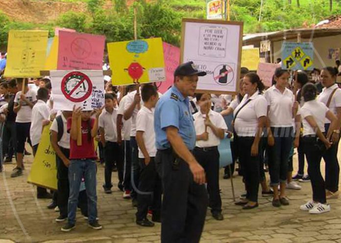 La población de El Jícaro, en Nueva Segovia, junto a la Policía Nacional y estudiantes de diversos colegios de secundaria y primaria, participaron de una marcha contra las drogas, la violencia y los accidentes de tránsito en esta ciudad ubicada en el norte de Nicaragua.