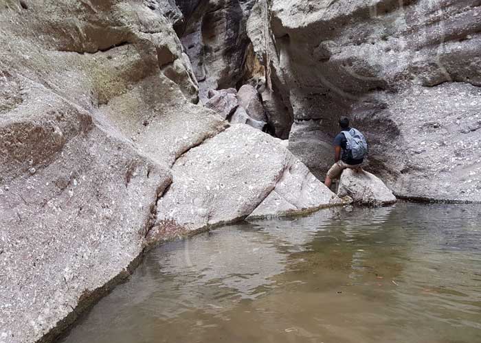 En la entrada del cañón abundan las peñas que deben ser escaladas con precaución, también hay pequeñas grutas donde el acceso suele ser más fácil para llegar a esas pozas donde el agua se conserva fresca.
