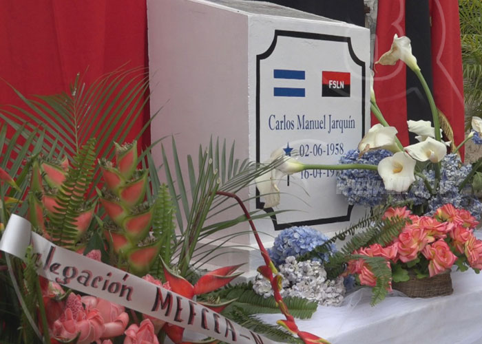 Carlos Manuel Jarquín; ”Jacinto”, que a sus 15 años se integró a la lucha guerrillera revolucionaria, fue recordada con amor y cariño por los concurrentes que depositaron ofrendas florales en el monumento ubicado a orillas de la Casa Cuna del héroe nacional, seguido de un acto político-cultural.
