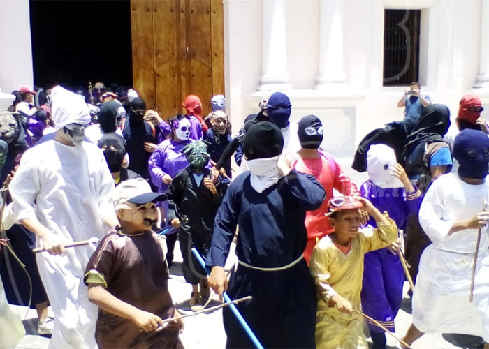 Jóvenes disfrazados con sotanas y máscaras de diferentes estilos, aglutinados en la iglesia católica de Nandaime, salieron a encontrarse con otro grupo de chavalos vestidos de la misma forma y que salen de la iglesia El Calvario.