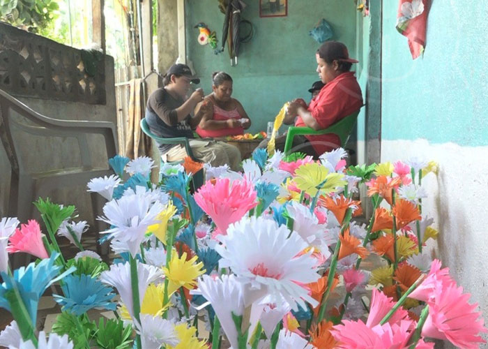 Lirios, rosas y una variada oferta de flores de plástico y papel a precios accesibles, los puede encontrar elaborados por esta familia emprendedora desde horas de la madrugada en el mercado municipal y camposantos de la ciudad de Masaya.