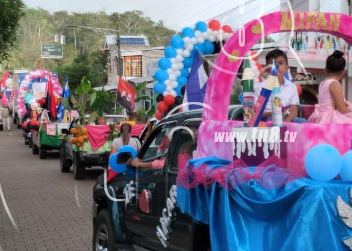 Con lindas carrozas la población marchó por las principales calles de Nueva Guinea, quienes mostraban alegría porque en trece años el gobierno nacional y local ha logrado mejorar muchas calles en la ciudad.