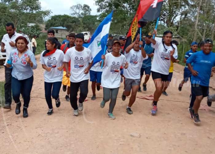 Estudiantes y atletas destacados del municipio recorrieron más de 80 km desde Bilwi hasta la comunidad de Sahsa, donde se hizo la entrega de la bandera a estudiantes de la zona para que continúe su recorrido por toda la región hasta llegar al departamento Matagalpa.