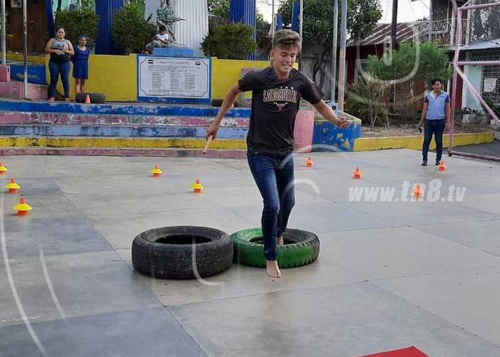 Esta actividad consistió en realizar carreras que estaban obstaculizadas, en las cuales los jóvenes debían brincar o cruzar llantas, saltar vayas, dar vueltas sobre colchonetas, realizar zigzag con los conos, hacer sentadillas, bajar y subir gradas, con el propósito de fortalecer sus habiliadades y destrezas, por lo que los jóvenes se encontraron muy motivados y entusiasmados por esta actividad, que fue promovida por la Juventud Sandinista 19 de Julio, a través del Movimiento Deportivo Alexis Argüello.