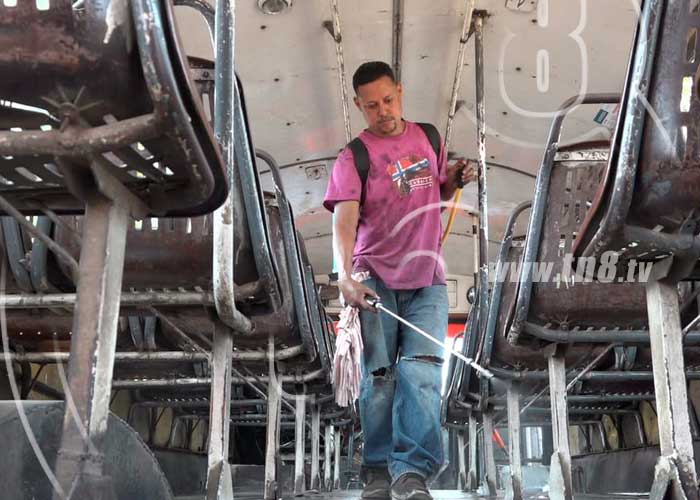 "Es importante hacer la limpieza para evitar el COVID-19, estamos dejando limpio para que la gente viaje con más confianza, nosotros viajamos de La Paz Centro a León, tenemos un viaje solo", destacó Gelson Humberto Granera, trabaja como ayudante de la ruta.