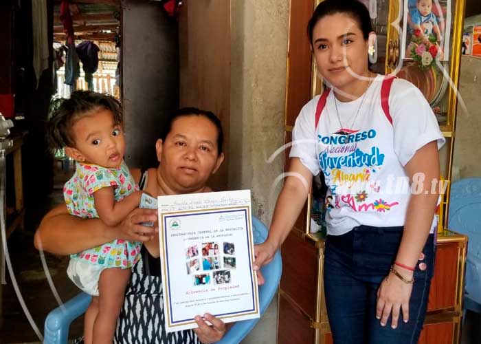 Un total de 16 títulos fueron entregados en distintos barrios de la ciudad, “una alegría para nosotros como juventud que en nombre del gobierno hacemos entrega de este valioso documento a cada familia, quienes nos reciben con mucho amor y cariño, como parte de un derecho que tienen como nicaragüenses”, expresó Daniela Robleto, Ejecutiva de la Promotoría Solidaria.