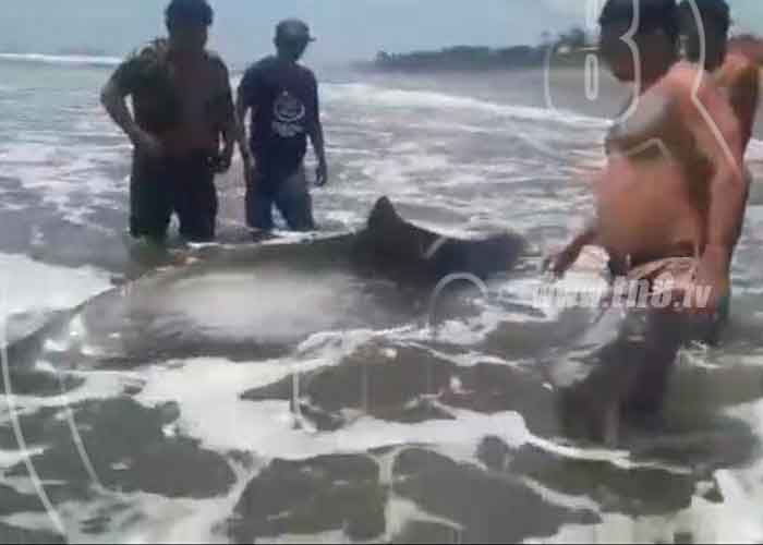 Pobladores de la zona costera del balneario de Las Peñitas en León, rescataron un delfín que había quedado varado en la arena. Después de varios minutos del esfuerzo de los lugareños, lograron introducirlo a las aguas más profundas.