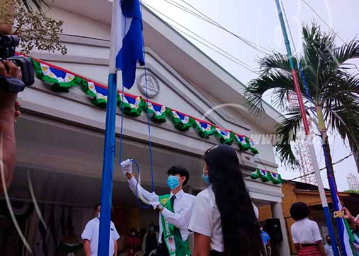 Los pabellones de la Autonomía fueron entregados por la presidenta del Consejo Regional Autónomo del Caribe Sur, Shaira Downs, y el pabellón nacional fue entregado por el coordinador del Gobierno Regional Autónomo del Caribe Sur, Rubén López, a los mejores alumnos de secundaria, quienes con amor patrio y autonómico realizaron la izada.