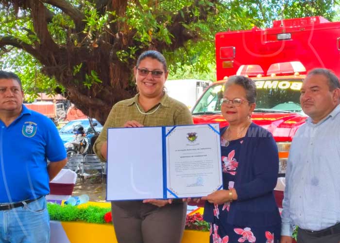 En el municipio de Somotillo la viceministra del Ministerio de Gobernación, Carla Salinas, recibió un reconocimiento por el desempeño y ardua labor de los Bomberos Unificados y Migración y Extranjería.
