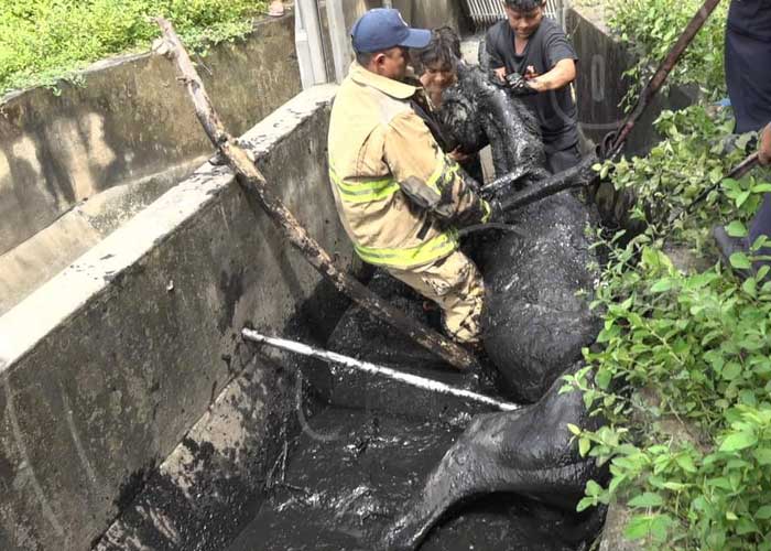 “Recibimos una llamada de la población a la estación de bomberos de Sutiaba, hicimos presencia hacia aquí al lugar y se procedió al rescate del semoviente, que ya se encontraba desde el día domingo (11 de octubre) ahí en esa canaleta de desaguadero de la pila séptica”, refirió el subcomandante Alejandro Acevedo de la DGB.