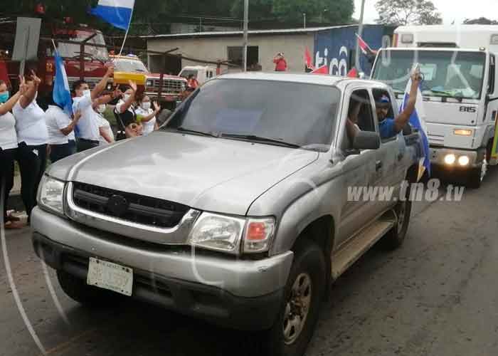 La salud de este ejército de hombres y mujeres de batas blancas se sumaron miembros de la Juventud Sandinista 19 de julio, autoridades departamentales y municipales, como siempre el resguardo incondicional de nuestra Policía Nacional quien reguló el tráfico vehicular para que la caravana pudiera transitar con fluidez.