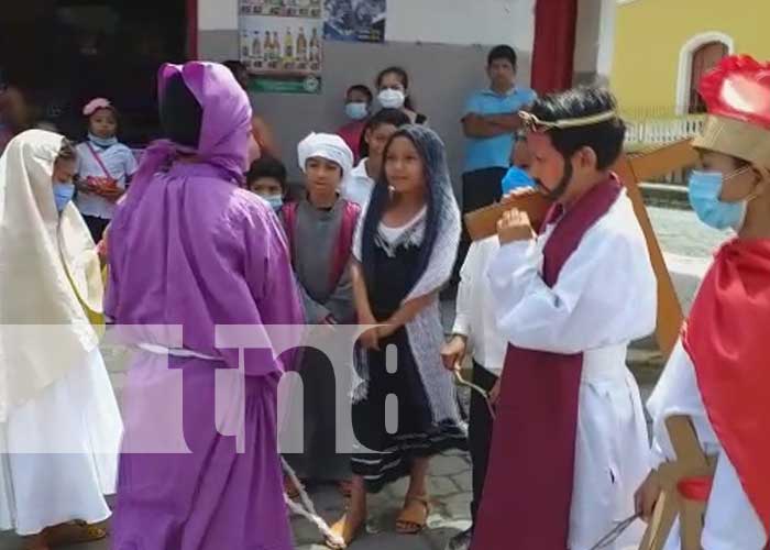 Con la participación de estudiantes de diferentes escuelas del municipio Diriomo, se realizó este jueves la recreación de escenas de la Pasión de Cristo en las calles centrales de este municipio, donde otros estudiantes también realizaron las famosas alfombras de aserrín.