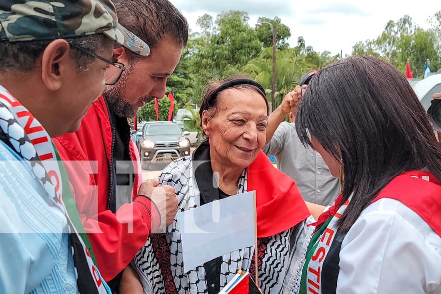 La valiente heroína Leila Khaled, defensora de la lucha palestina, fue recibida con honores por las autoridades municipales y militancia sandinista en la ciudad de Ocotal, Nueva Segovia; quienes la acompañaron en un recorrido por sitios históricos y culturales en la Ruta del General Sandino.