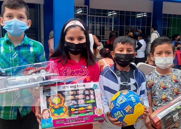 «Tenemos para entregar el día de hoy a 1 mil 396 protagonistas. Estos juguetes que traen alegría, desde preescolar hasta el quinto grado. El único requisito es que los niños asistan a las aulas a estudiar a aprender para seguir cada día avanzando en victorias»; dijo Josué Chavarría, director del centro público Cristóbal Rugama, en Masaya.