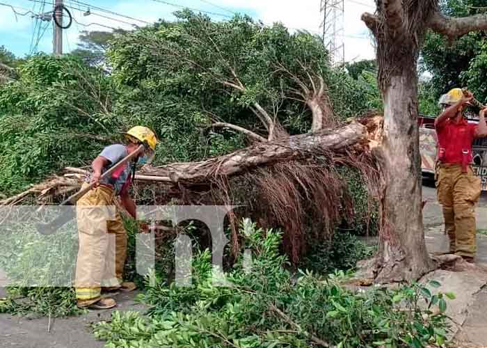 Miembros del Benemérito cuerpo de bomberos de Jinotepe – Carazo, simultáneamente que atendía la caída de la rama sobre la vía.