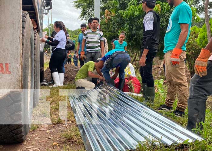 El Alcalde de Juigalpa junto a las demás autoridades con el apoyo de Juventud Sandinista y UNEN visitaron todos los barrios inundados para hacer entrega de láminas de zinc y clavos.