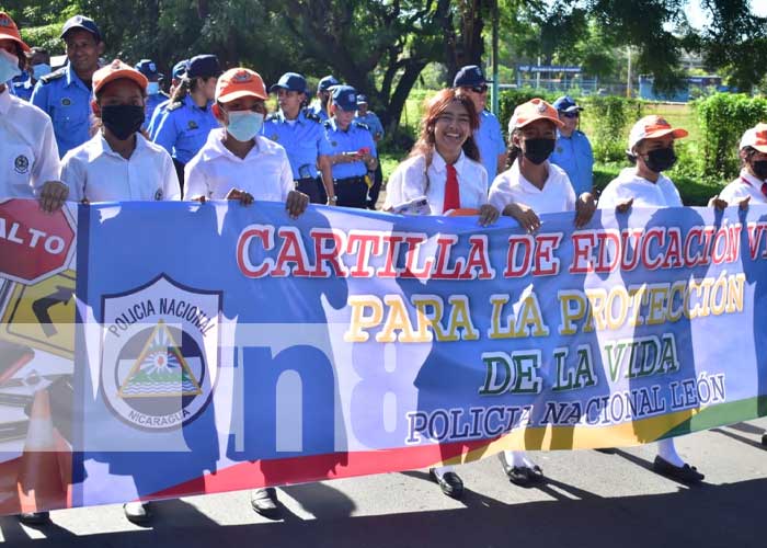 Estudiantes de secundaria, autoridades municipales, departamentales y policía de León; participó de una alegre y colorida caminata como parte del Plan Nacional de Emergencia Vial.