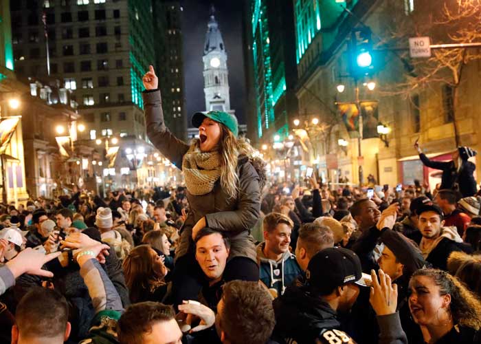 La lluvia y el granizo que cayeron sobre Filadelfia buena parte del día remitieron justo cuando, en toda la ciudad, la gente empezó a salir de bares de deportes, apartamentos y casas.