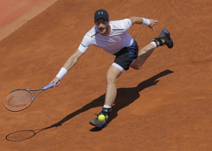 ARCHIVO - Foto del 29 de abril del 2017, el británico Andy Murray se estira para alcanzar la pelota en el duelo ante el austriaco Dominic Thiem en el Abierto de Barcelona. El sábado 23 de noviembre del 2024 se dio a conocer que Murray será entrenador de Novak Djokovic en el Abierto de Australia. (AP Foto/Manu Fernandez, Archivo)