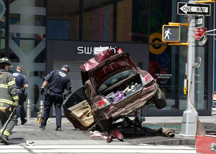 Tras su fatal recorrido por Times Square, el automóvil finalmente se estrelló en la calle 45 Oeste y la avenida Broadway contra una columna y postes metálicos, quedó apoyado sobre dos ruedas y se incendió.
