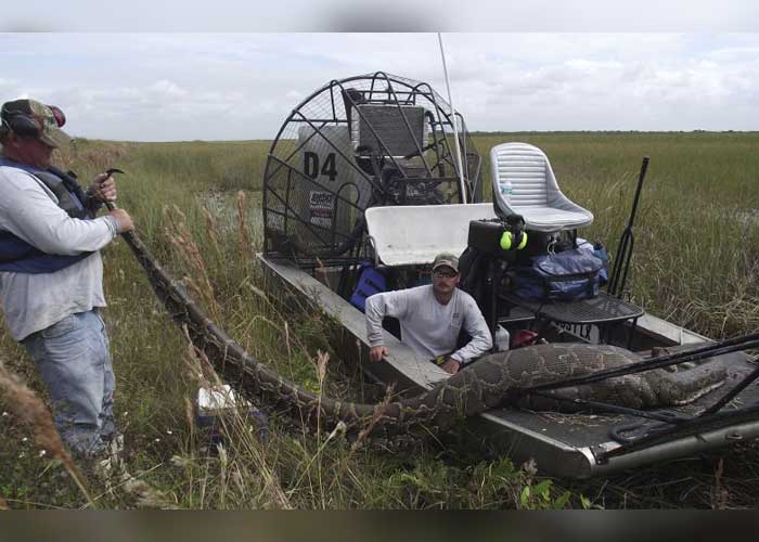 La más grande de las pitones eliminadas medía cinco metros. Según medios locales, la mató Dusty "The Wilderman" Crum, un cultivador de orquídeas y experto cazador de pitones.