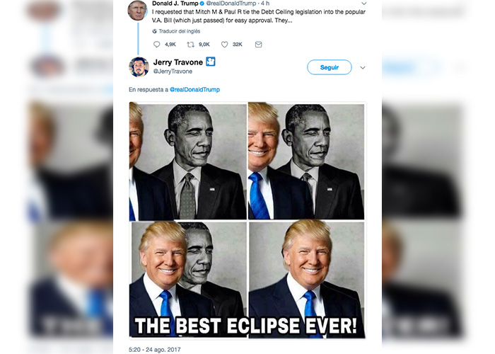 Washington, 24 ago (EFE).- El presidente de Estados Unidos, Donald Trump, compartió hoy en su cuenta de Twitter un meme con una imagen de sí mismo bloqueando paulatinamente una foto de su predecesor en la Casa Blanca, Barack Obama, y con el subtítulo "El mejor eclipse de la historia".