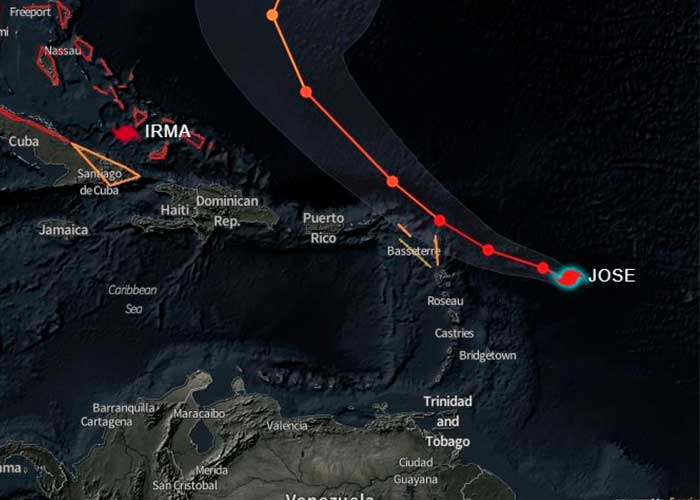En su boletín de las 21.00 GMT de hoy, los vientos huracanados de José alcanzan los 45 kilómetros (25 millas) desde el centro del ciclón y los de tormenta tropical llegan a los 220 kilómetros (140 millas).