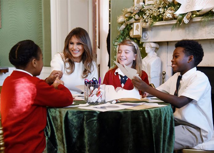 La exmodelo eslovena recorrió cada una de las salas decoradas y deseó una feliz Navidad en nombre de su esposo y el hijo de ambos, Barron, con el que recibió hace una semana el árbol navideño oficial de la Casa Blanca, un abeto que ya preside la Sala Azul de la residencia presidencial.