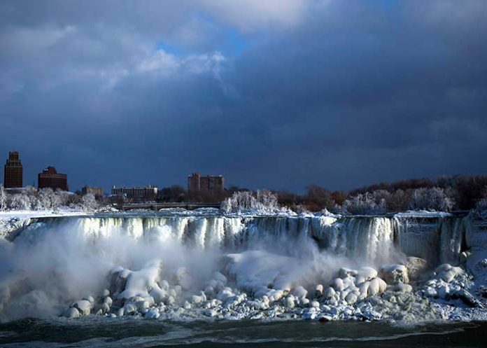 Aunque todo alrededor a su alrededor está helado, el agua sigue fluyendo y creando una fina llovizna en las tres cascadas que conforman la turística frontera natural entre Estados Unidos y Canadá. El viento del oeste suele soplar hacia el lado estadounidense, explicó el meteorólogo del Servicio Meteorológico Nacional Steven Welch, donde la humedad viste cada centímetro del paisaje de blanco.