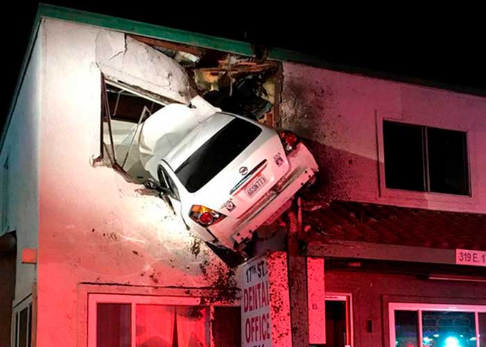 La Autoridad de Bomberos del Condado de Orange (OCFA, por sus siglas en inglés) publicó imágenes en su cuenta de Twitter de la increíble escena, en las que se aprecia un sedán blanco incrustado en el edificio. Inicialmente informaron que una persona todavía estaba atrapada dentro del vehículo mientras que la otra ya había conseguido escapar.