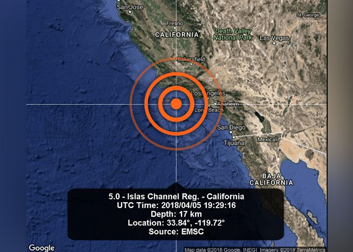 El Servicio Geológico de Estados Unidos informó que el movimiento se registró a las 12:29 p.m. en la región de las Islas Channel, a 61 kilómetros (38 millas) al sudoeste de Ventura.