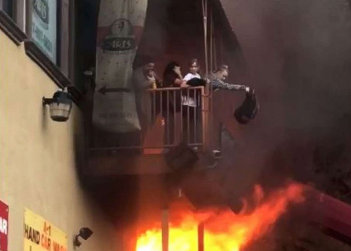 Young students leap from a balcony to escape a fire at a dance studio in Edgewater, New Jersey.