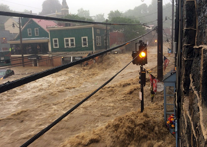 Fue posible ver fotografías y videos publicados por sitios noticiosos en los que el agua corría por la avenida principal en Ellicott City, a unos 20 kilómetros (13 millas) al oeste de Baltimore. La comunidad, ubicada en la margen occidental del río Patapsco de Maryland, fue devastada por inundaciones en julio de 2016.