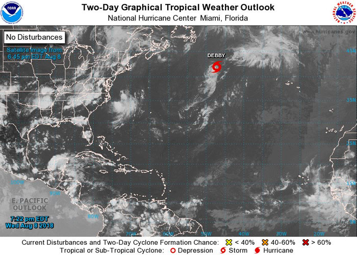 La tormenta Debby mantendrá esta dirección hasta que se disipe el viernes en el lejano Atlántico Norte convertida en "extratropical".