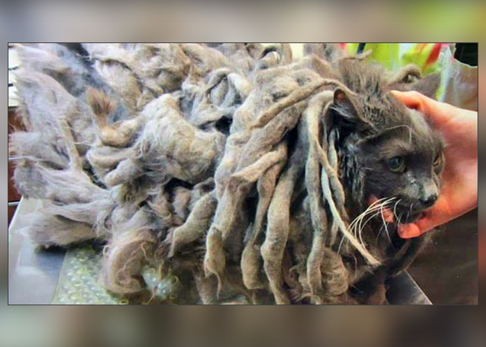 Cuando los empleados del refugio miraron dentro, no podían creen lo que veían sus ojos. De hecho, primero pensaron que se trataba de un perro, pero al retirar la parte superior de la transportadora vieron que era un gato, con el pelaje tan enmarañado que no podía ni moverse. Estaba claro que había estado viviendo así durante meses, si no años.