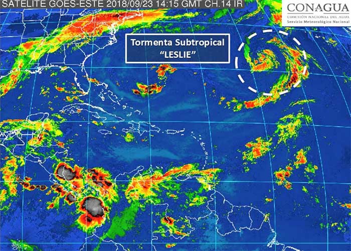 #23Sep 11am Se ha formado la Tormenta Subtropical Leslie a 1845Km al WSW de Las Azores (Atlántico Norte) vientos 65Kmh pic.twitter.com/jGMII7u2Kp