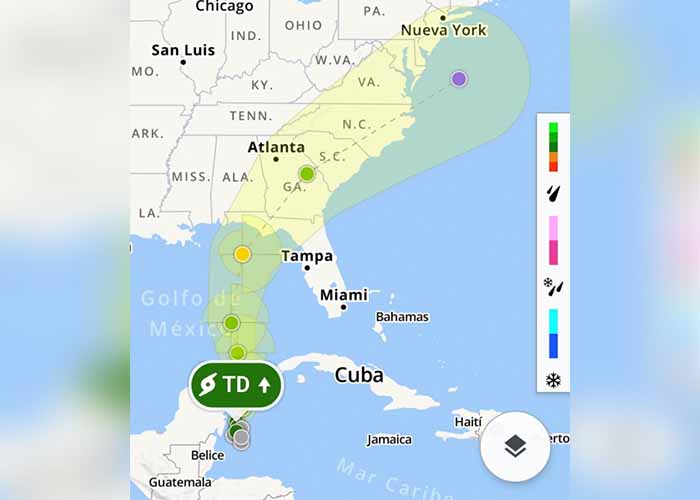 La entidad con sede en Miami pronostica que la depresión se moverá cerca de la punta noreste de la Península de Yucatán el lunes por la mañana, y luego cruzará el este del Golfo de México desde el lunes hasta el miércoles por la mañana.