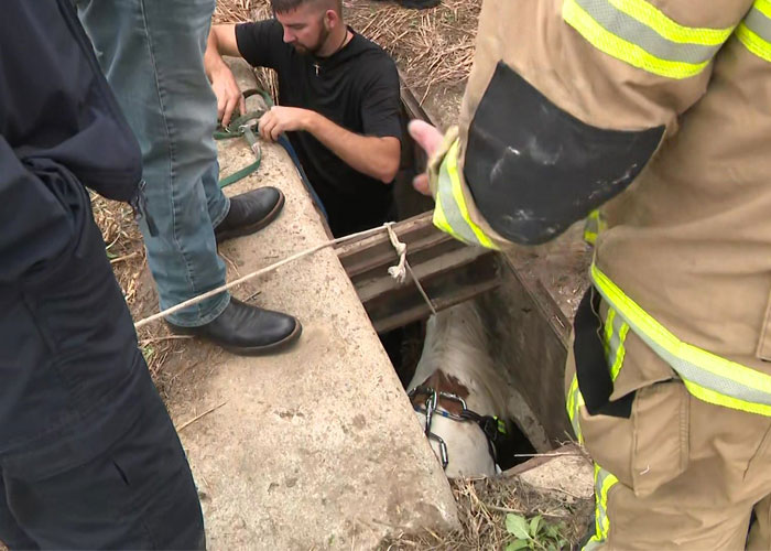 Los bomberos de Houston tuvieron que romper el concreto alrededor de la alcantarilla y sacaron al pony de color blanco con marrón.