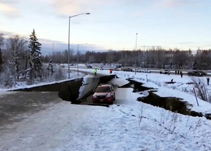 Las fotografías publicadas en las redes sociales mostraron daños que incluían el derrumbe de las placas del techo de una escuela secundaria de Anchorage y la deformación de algunos caminos. Una imagen mostraba un coche varado en una isla de pavimento, rodeado de grietas cavernosas donde el terremoto partió la carretera.