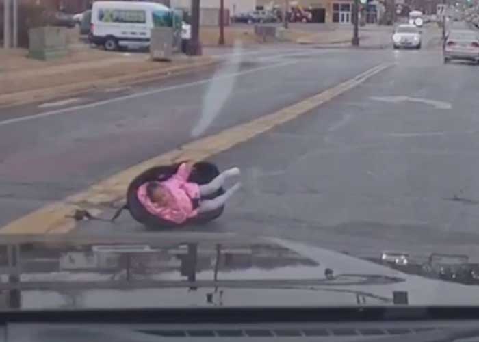 Un video de Chad Cheddar Mock, publicado en redes sociales, muestra a una niña de 2 años, amarrada a su silla de bebé, que sale despedida por la puerta trasera del lado del conductor, mientras el sedán giraba en una esquina.