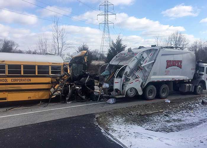 Un autobús escolar se estrelló el miércoles contra un camión de la basura en el sureste de Indiana, lo que dejó a un estudiante de 13 años gravemente herido y a otros 18 alumnos y dos adultos con lesiones menores, informaron las autoridades.