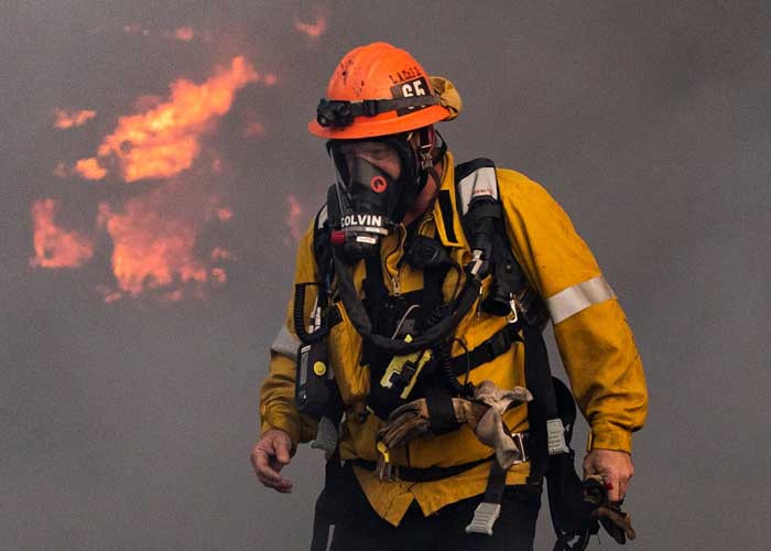 Los bomberos en terrenos empinados apagaban pequeños incendios aunque temían vientos que podrían propagar brasas, dijo el capitán de los Bomberos del Condado de Ventura Steve Kaufmann.