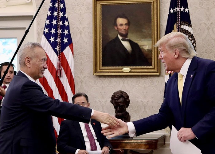 "Durante décadas, los trabajadores, agricultores, ganaderos, fabricantes e innovadores estadounidenses se han visto afectados por el comercio injusto con China. […] Desde que China se unió a la Organización Mundial del Comercio hace dos décadas, hemos acumulado casi cinco billones de dólares —espero que el viceprimer ministro no esté escuchando esto— en los déficits comerciales", ha afirmado Trump. Asimismo, ha declarado que EE.UU. levantará las barreras arancelarias contra las importaciones chinas si las partes conciertan la segunda fase del acuerdo.