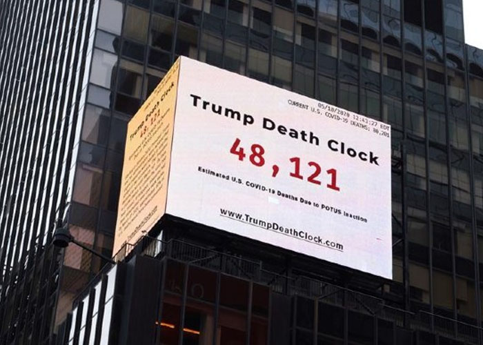El “Reloj de la muerte de Trump” puesto en marcha en Nueva York, que contabiliza en tiempo real los decesos por la COVID-19 en Estados Unidos, le atribuye al presidente Donald Trump al menos el 60 por ciento de los muertos por la pandemia.