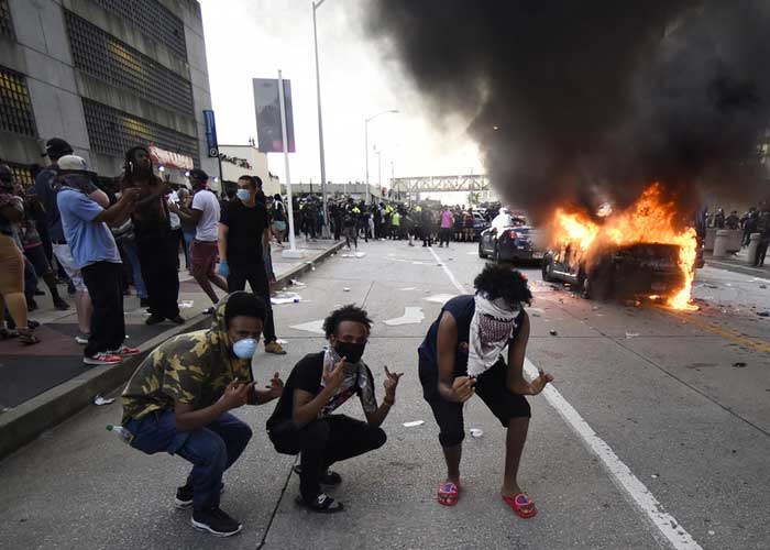 Un gran grupo de manifestantes permanece en las calles de Mineápolis a pesar de la orden de toque de queda, que rige desde esta noche para controlar los disturbios generados tras la muerte de George Floyd, el afroamericano que falleció bajo custodia policial a principios de esta semana.