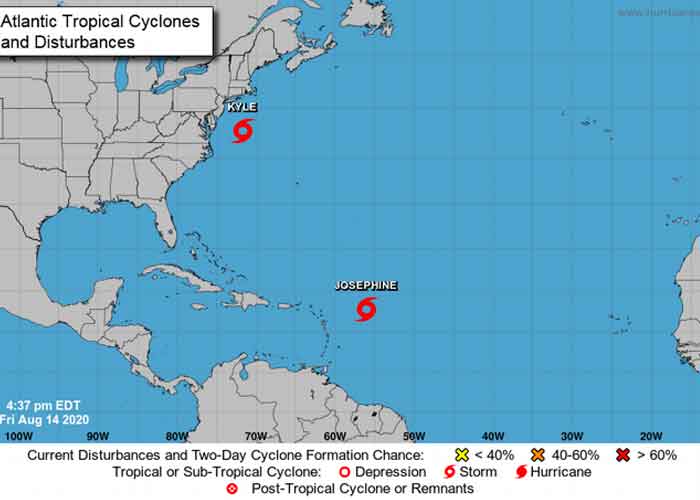 Miami, 14 ago (EFE).- La tormenta tropical Kyle se formó este viernes en aguas del noroeste del océano Atlántico, mar afuera de la costa de Nueva Jersey (EE.UU.), sin que por el momento revista algún peligro en tierra, mientras Josephine avanza por la cuenca oriental del mar Caribe cerca de las islas de Sotavento.