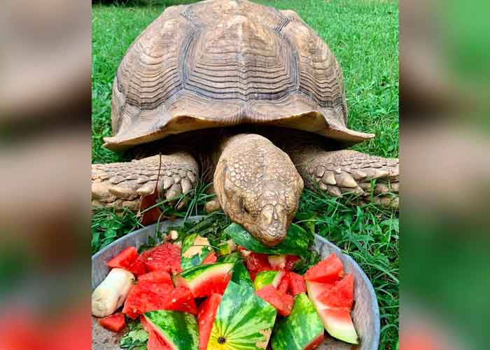 Lynn ha estado con Solomon desde hace 15 años, cuando el animal era una solo una cría del tamaño de una pelota de ping-pong, y ahora mide cerca de 91 centímetros de largo y sigue creciendo. La Sulcata, también conocida como la tortuga con espuelas africana, puede vivir más de 100 años.