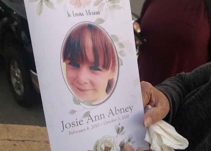 Josie Ann Abney, de 10 años, falleció el 3 de octubre en un hospital poco después de haber sido ingresada tras sufrir un desmayo. Según los forenses, la niña pesaba solo unos 15 kilos, casi la mitad del peso de lo que debería tener una menor a esa edad. Además, las autoridades locales dijeron que estaba tan demacrada y deshidratada que los médicos no lograron extraerle sangre para los análisis.